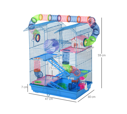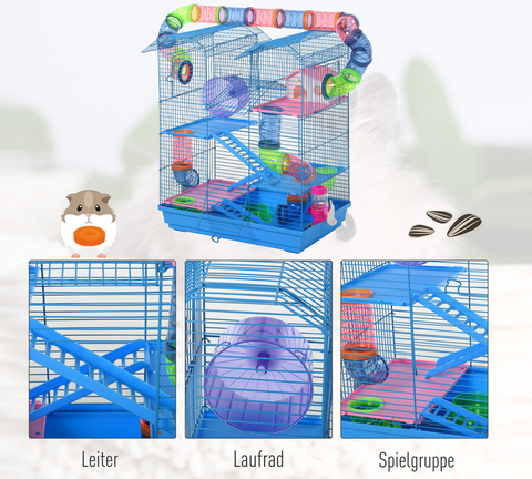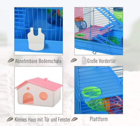 Halten Sie Ihre kleinen Haustiere sicher und glücklich mit unserem verspieltem Multi-Level-Indoor-Kleintierkäfigset. Dieses Starterkit im tierfreundlichen Design bietet mehrere Plattformen für Bewegung, Spaß, Entspannung und Erkundung für kleine Haustiere wie Hamster, Mäuse, Wüstenrennmäuse usw. Das Set enthält verschiedene Zubehörteile wie Unterschlüpfe, Laufräder, Wasserflaschen und Näpfchen.